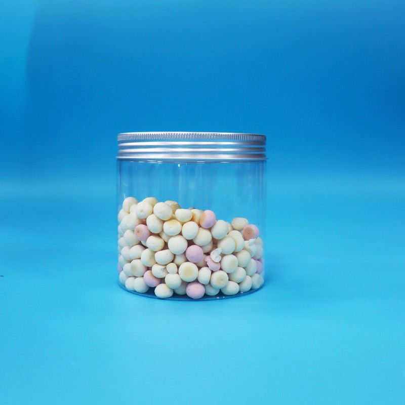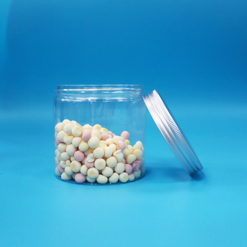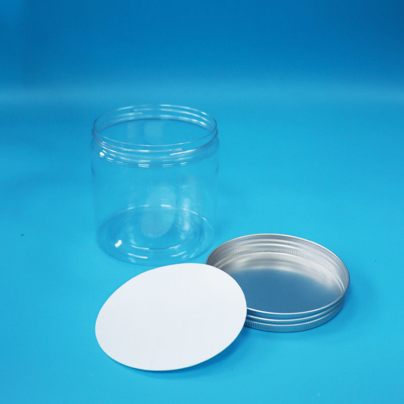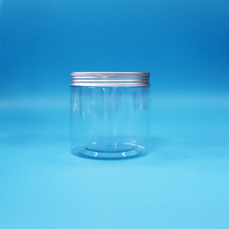 مستديرة واسعة الفم أسطوانة الشكل واضحة بيت الكعك البلاستيكية الجرة الغطاء المسمار الألومنيوم